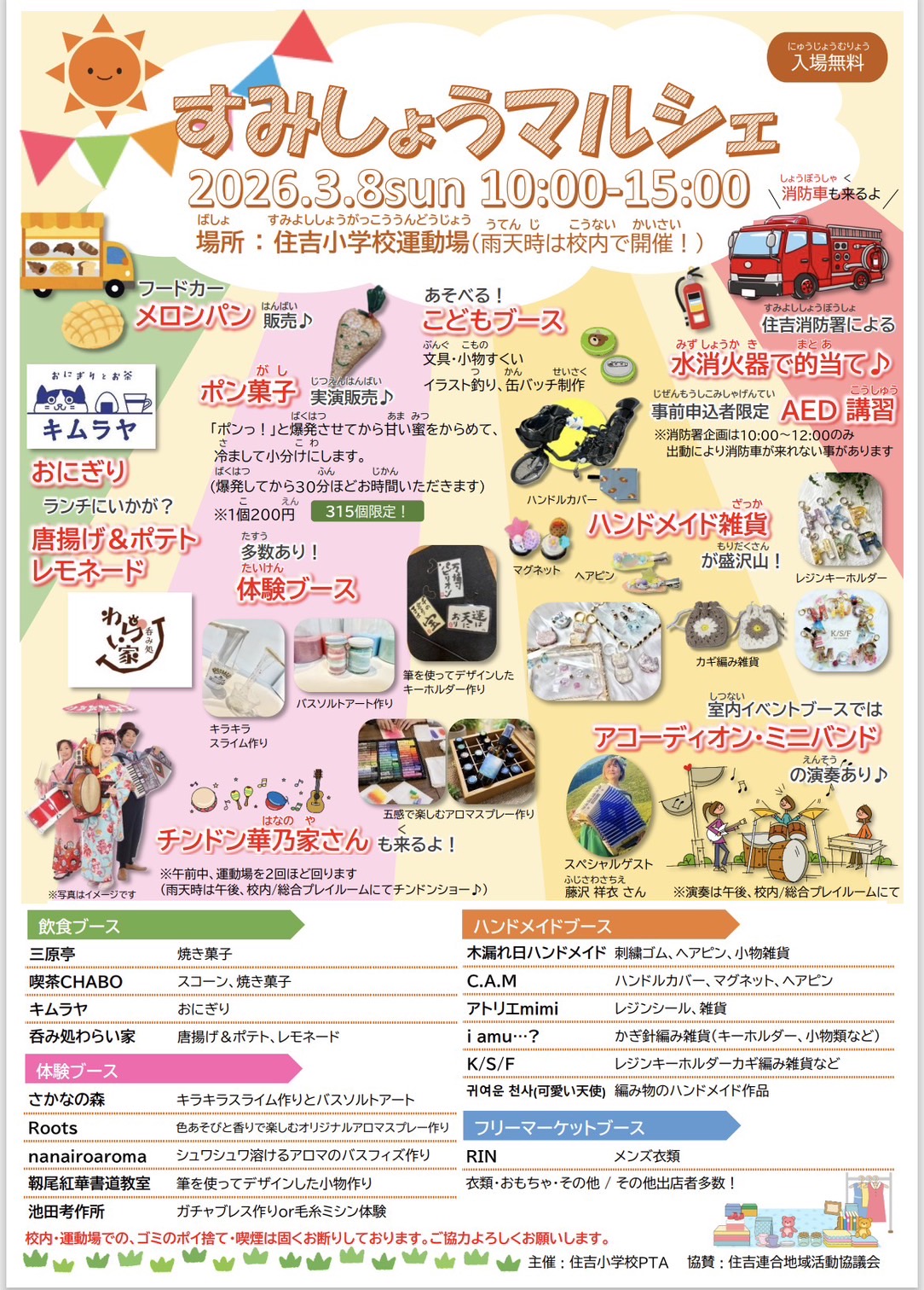 アコーディオン演奏、ちんどん演奏、 マルシェでは三原亭のおやつも販売! 大忙しの1日を楽しみます笑 時間:10:00~15:00 料金:入場無料。 マルシェで飲食やお買い物をお楽しみください。 場所:住吉小学校 大阪市住吉区帝塚山西4-1-35 出演:チンドン華乃家 藤沢祥衣(accordion) 三原亭、、その他いっぱい |