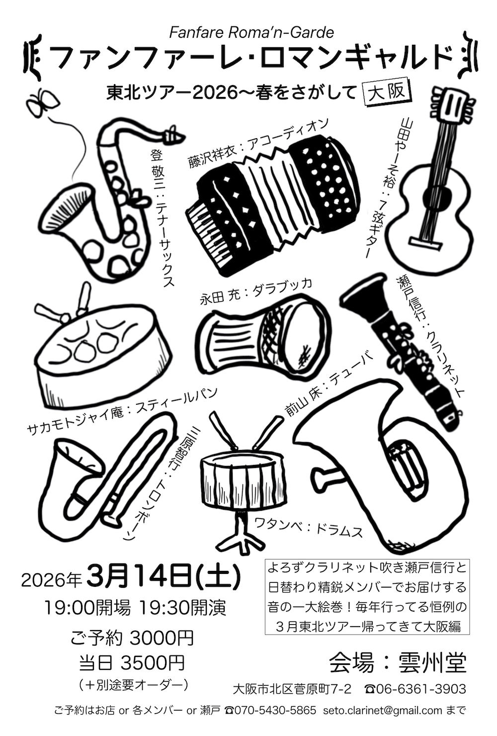 ■3月14日(土) Fanfare Roma'n-Garde@雲州堂ファンファーレ・ロマンギャルドの 東北ツアー2026春をさがして~大阪編 時間:open19:00/start:19:30 料金:前¥3,000/当¥3,500(別途オーダー必要) 場所:南森町雲州堂 大阪市北区菅原町7−2 出演:Fanfare Roma'n-Garde 瀬戸信行:clarinet 登 敬三:tenor sax 三原智行:trombone 前山 床:tuba 藤沢祥衣:accordion サカモトジャイ庵:steelpan 山田やーそ裕:7-strings guitar ワタンベ:drums 永田充:darbuka, davul |