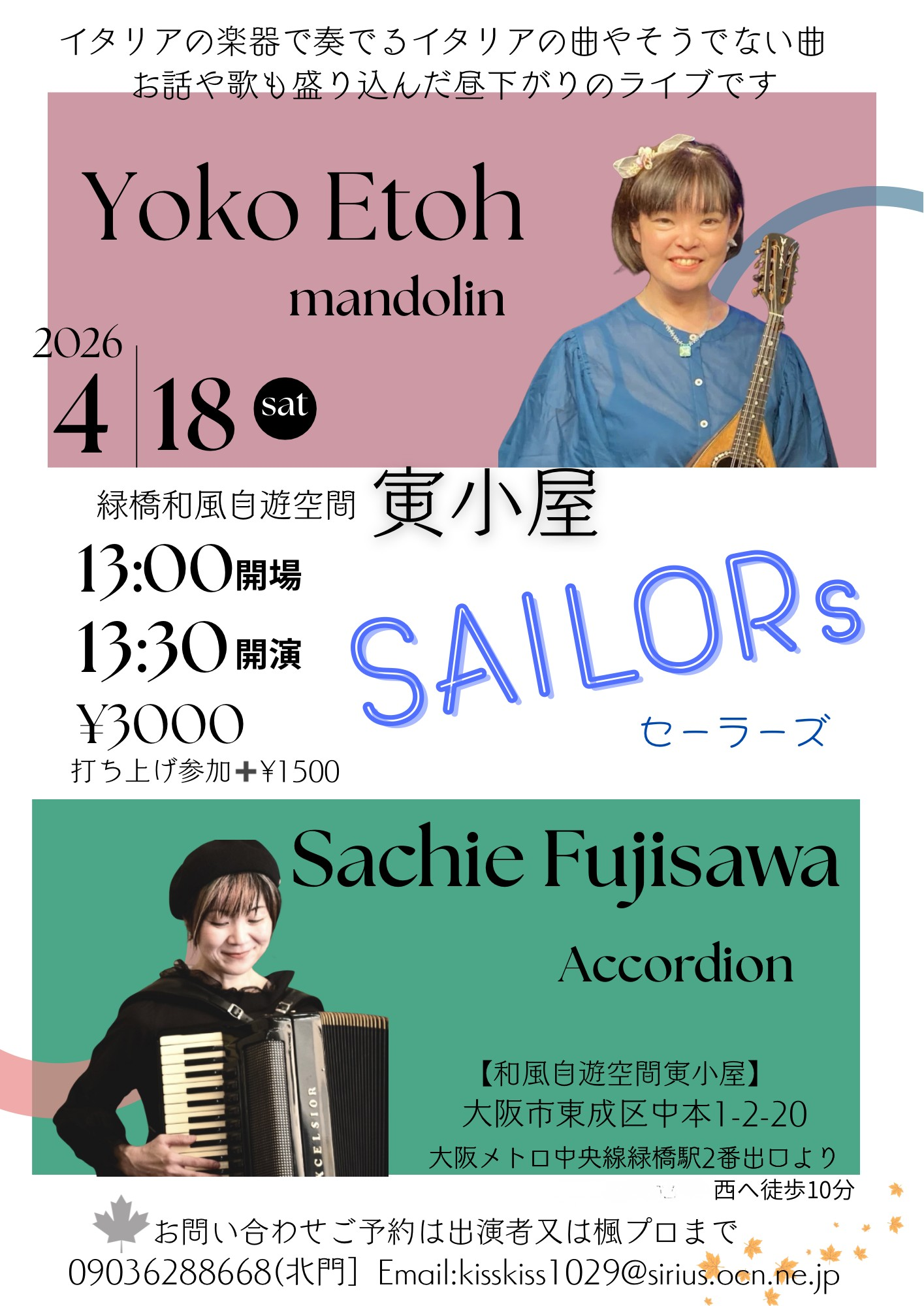 時間:open13:00/start:13:30 料金:¥3,000(打ち上げ参加費+¥1,500) 場所:緑橋寅小屋 大阪市東成区中本1-2-20 出演:セーラーズ 江藤ようこ(マンドリン) 藤沢祥衣(アコーディオン) |