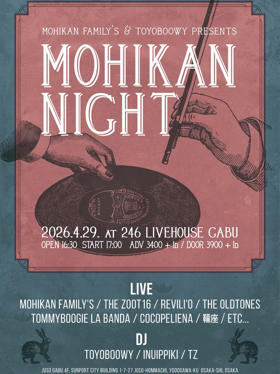 2nd Album 「Strolling Through Hazy Borders」Release Party!! MOHIKANFAMILYS &TOYOBOOWY PRESENTSの モヒカン2ndアルバムのリリース大パーティー! 鞴座も演奏します。他、豪華出演者いっぱいの楽しい夜!! 時間:open16:30/start:17:00 料金:前¥3,400/当¥3,900(1drink別) 場所:十三GABU 大阪市淀川区十三本町1丁目7-27 サンポードシティビル4F 出演:MOHIKAN FAMILY'S THE ZOOT16 Revili'O The OLDTONES TommyBoogie La Banda Cocopeliena 鞴座 etc... DJ toyoboowy INUIPPIKI TZ |